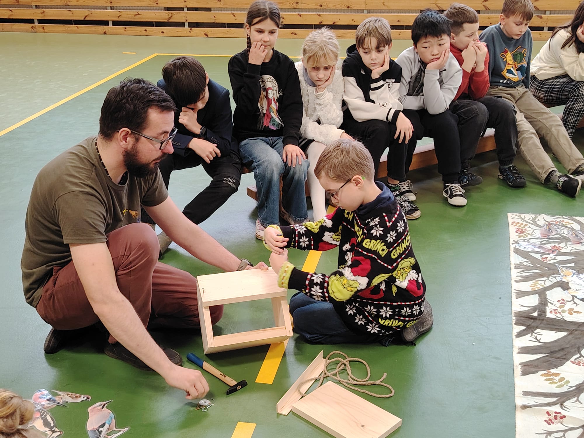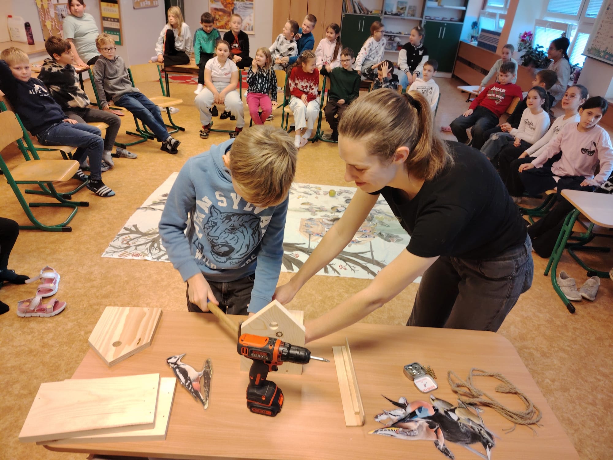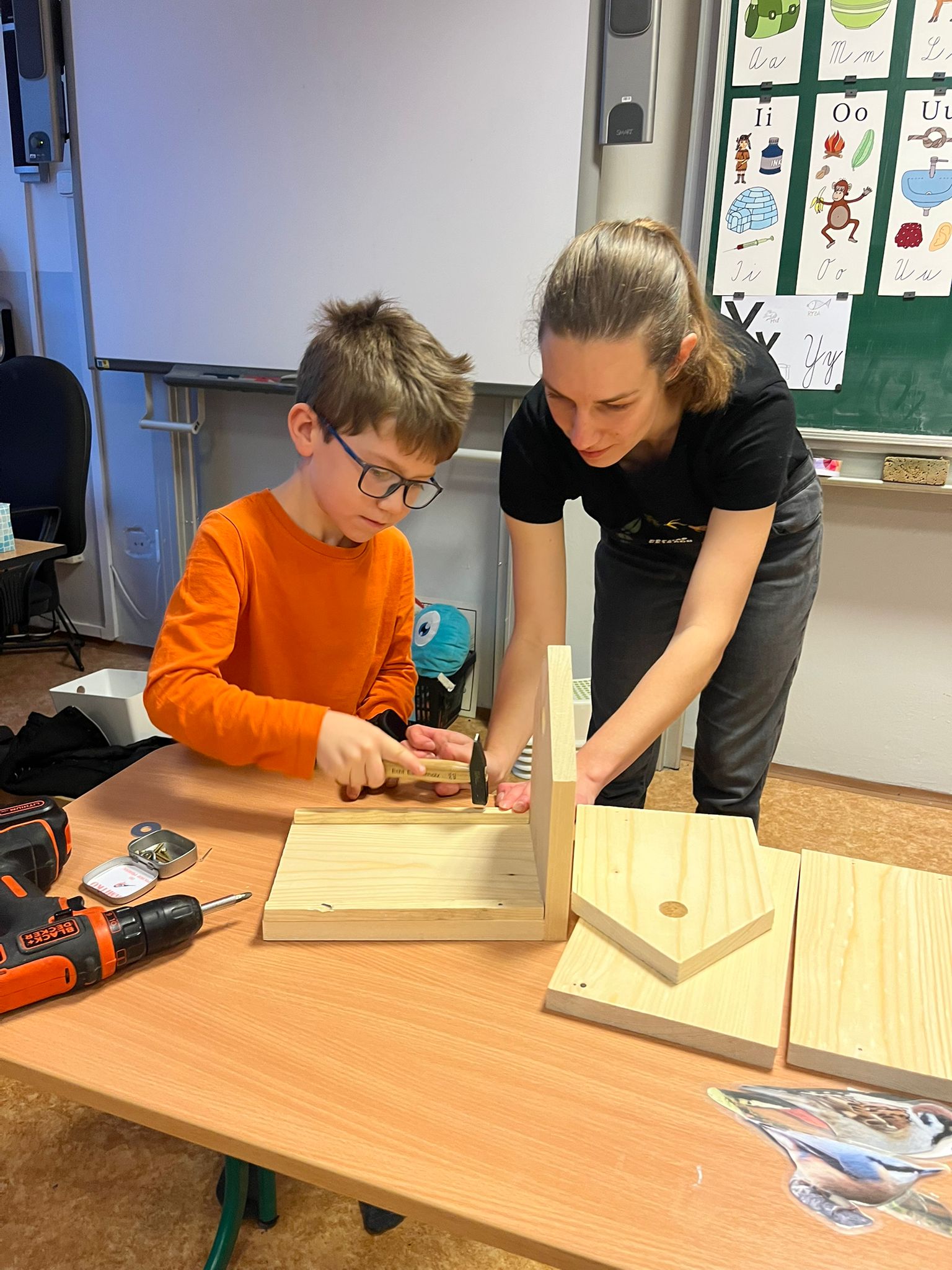 Na závěr si děti společně postavily dřevěné krmítko, které zůstane na školní zahradě. Od