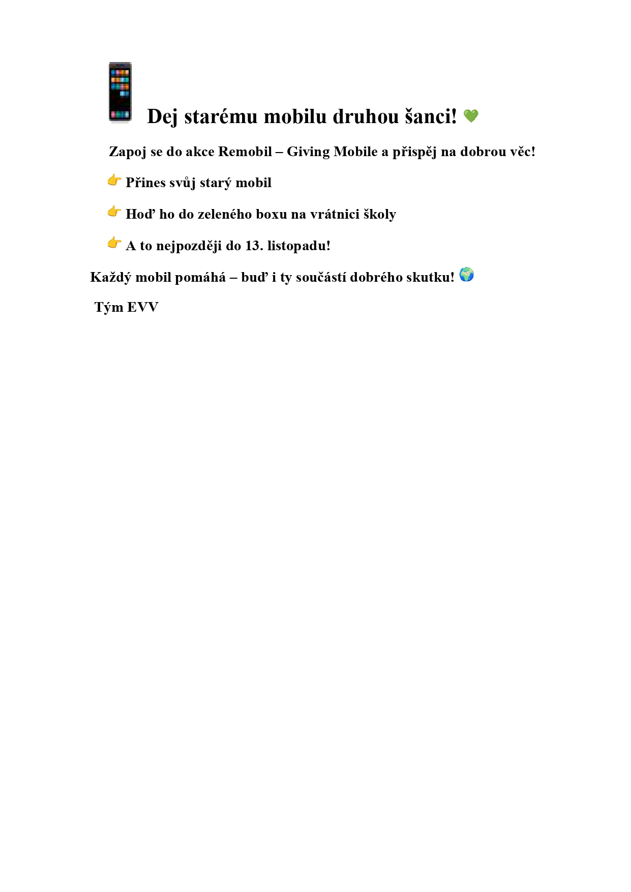 Stačí najít svůj starý, nepotřebný mobila a do 13. listopadu 2025 ho vložit do zeleného boxu na vrátnici školy.