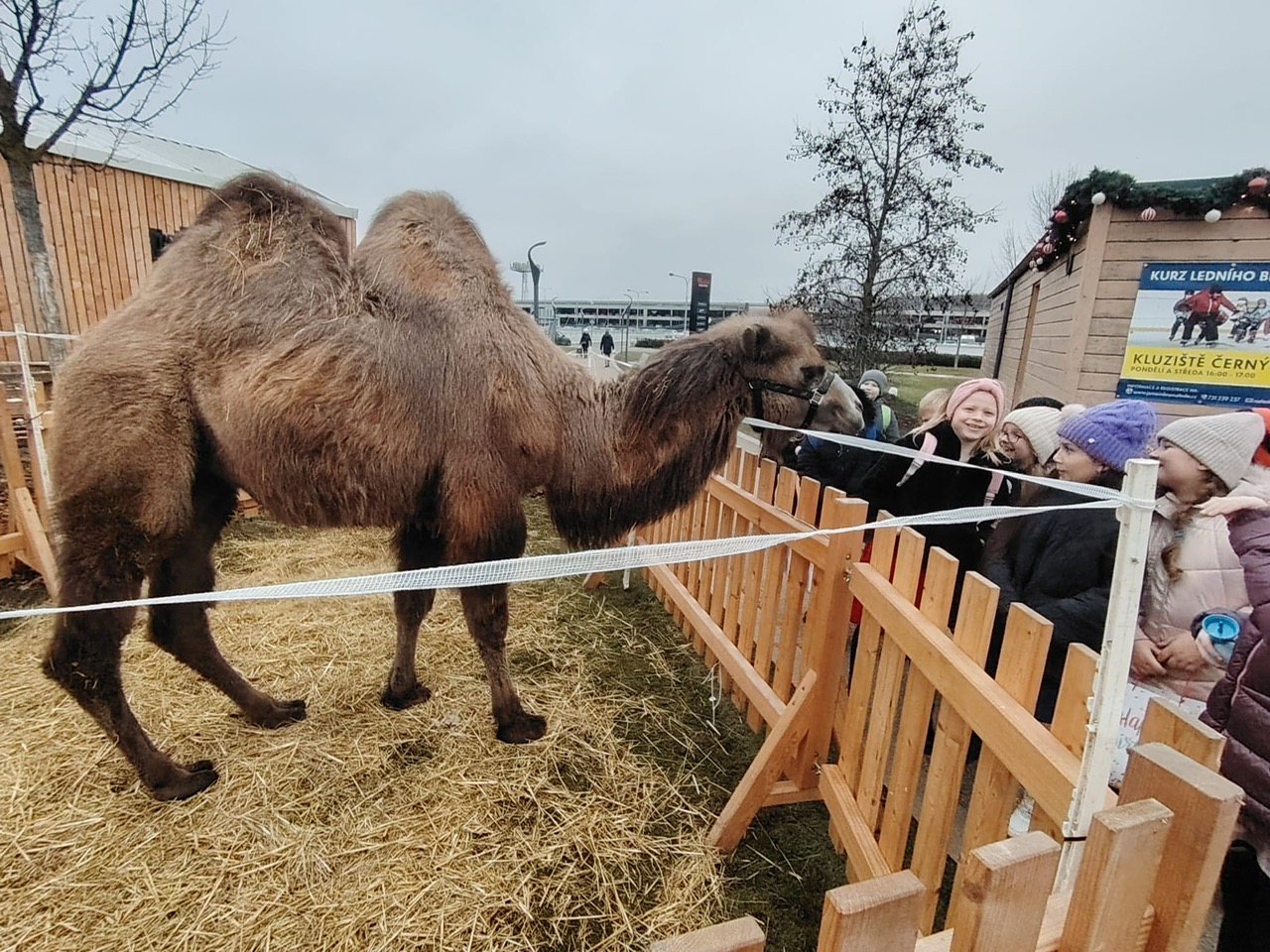Cestou zpět jsme zhlédli dřevěný betlém se živými zvířaty. Zvědavý velbloud se domáhal